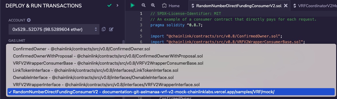In the file explorer, open RandomNumberDirectFundingConsumerV2.sol.
